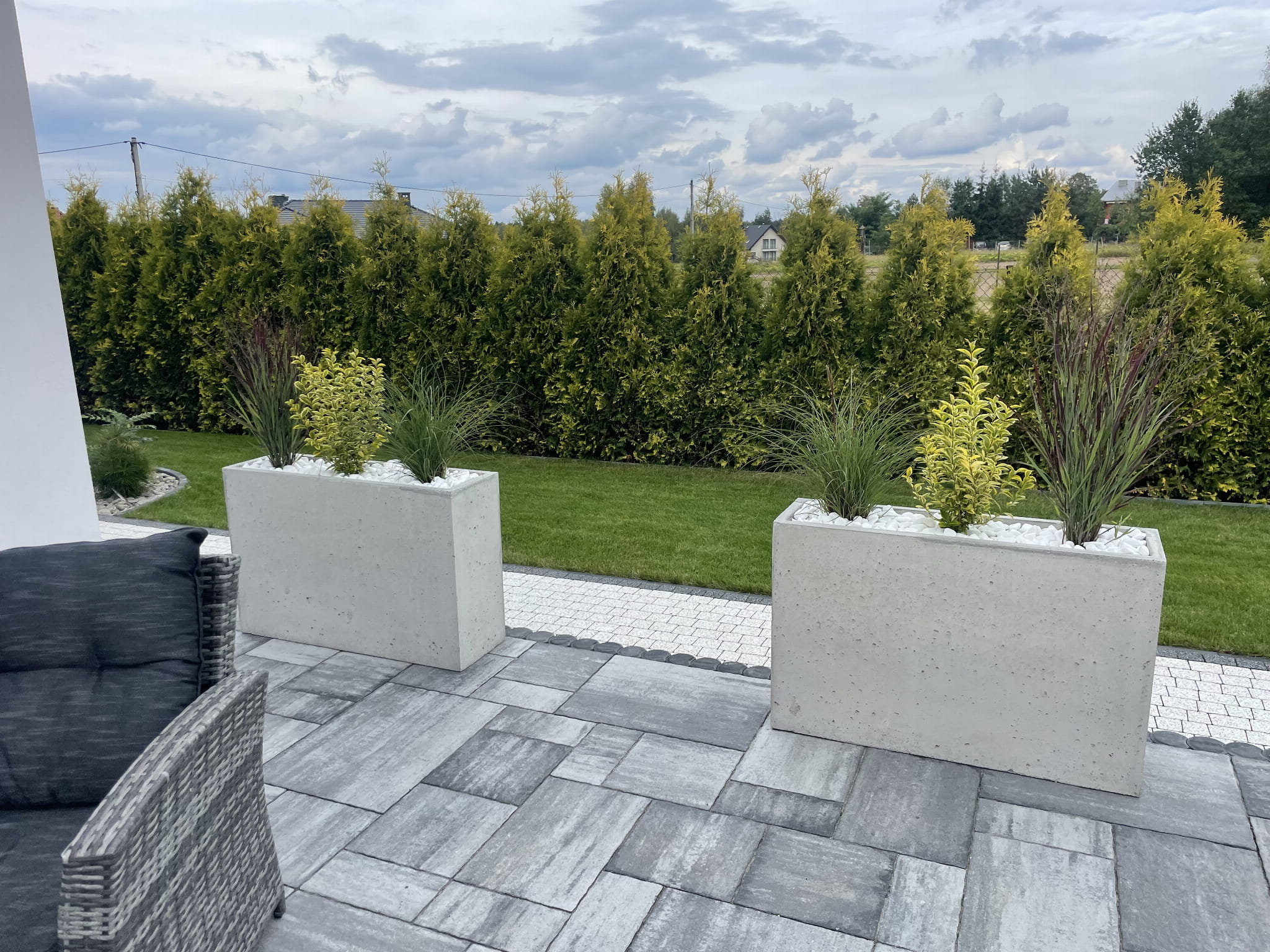 Smukła, prostokątna donica z betonu architektonicznego, idealna do nowoczesnych tarasów, wejść i wąskich przestrzeni.