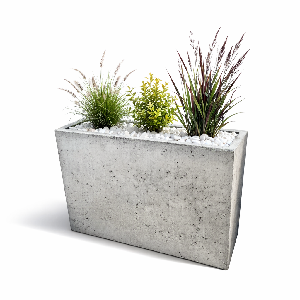 Wydłużony kształt daje wiele możliwości kompozycyjnych — od traw ozdobnych, przez rośliny sezonowe, aż po uporządkowane nasadzenia w przestrzeniach komercyjnych. Beton architektoniczny nadaje donicy nowoczesny, minimalistyczny wygląd i zapewnia trwałość, której oczekuje się od produktów użytkowanych na zewnątrz, ale równie dobrze prezentujących się we wnętrzach.