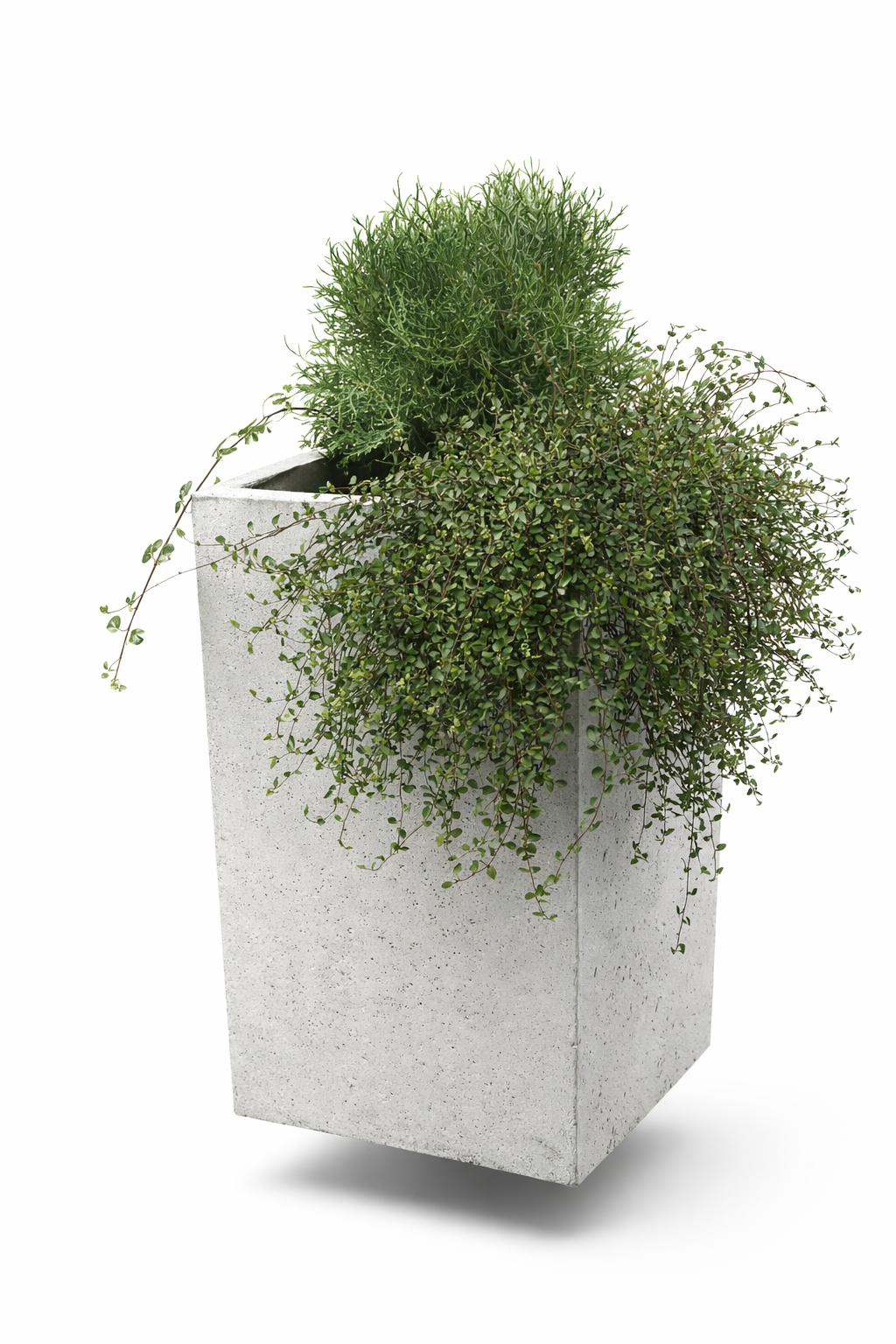 Smukła, prostokątna donica z betonu architektonicznego, która porządkuje przestrzeń i elegancko eksponuje rośliny.