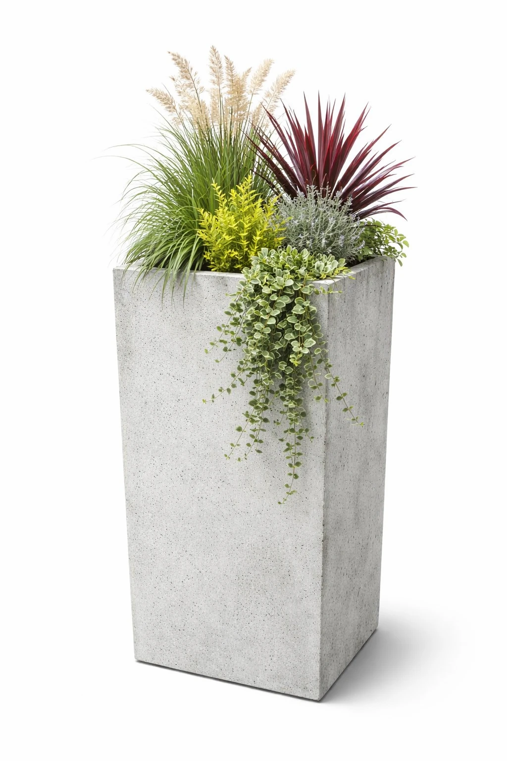 Wysoka donica z betonu architektonicznego, idealna do efektownych aranżacji przy wejściach, tarasach i przestrzeniach komercyjnych.