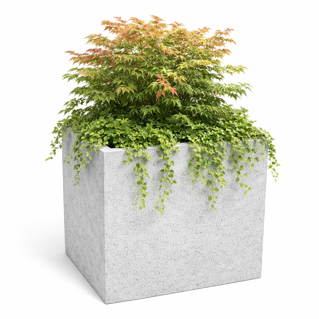 Model ten daje dużą swobodę w doborze roślin — sprawdzi się przy nasadzeniach z krzewów, traw ozdobnych oraz roślin sezonowych, tworząc eleganckie i uporządkowane kompozycje. Beton architektoniczny nadaje donicy nowoczesny, minimalistyczny charakter i pozwala łatwo dopasować ją do różnych stylów przestrzeni, zarówno prywatnych, jak i komercyjnych.