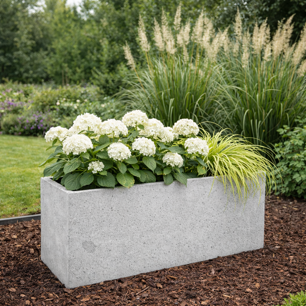 Model ten pozwala tworzyć eleganckie kompozycje z traw ozdobnych, roślin sezonowych czy niskich krzewów, a beton architektoniczny nadaje całości nowoczesny, minimalistyczny charakter. Donica dobrze komponuje się zarówno z zielenią, jak i współczesną architekturą.